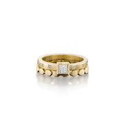 Diamond ring: 2.8 mm wide band with princess cut center stone. 0.25 carat weight. SI quality. Color G-H. 3 diamonds are set at each side of the diamonds as a nice accent decoration on each side. A total of 0.45 carat weight. SI quality. Color G-H. Matte finish.