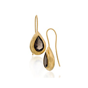 Dangle earrings with pear cut smokey quartz. The earrings measure approximately 3.2 cm = 1 1/4″ inch from top to bottom. Theses earrings hug your ear and create a nice sparkle with the flush set quartz creating contrast to the delicate texture. The pear cut bezel has a 12×8 cm smokey quartz that contrast the bezel nicely and adds glamour.